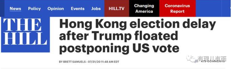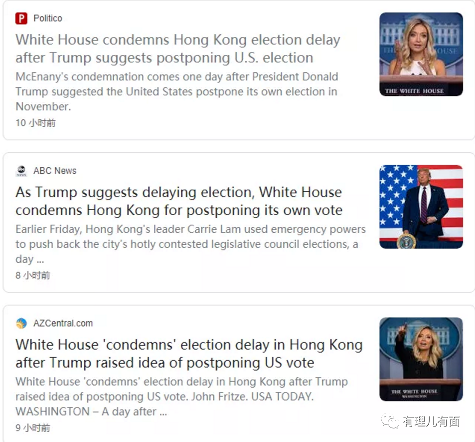 美国再现“驰名双标”,8月1日白宫新闻秘书麦克纳尼拿出一份事先准备好的声明说:“我们谴责香港政府将立法会选举推迟一年,并取消反对派候选人资格的决定。”而就在一天前,特朗普才刚刚提议推迟11月的美国总统大选。