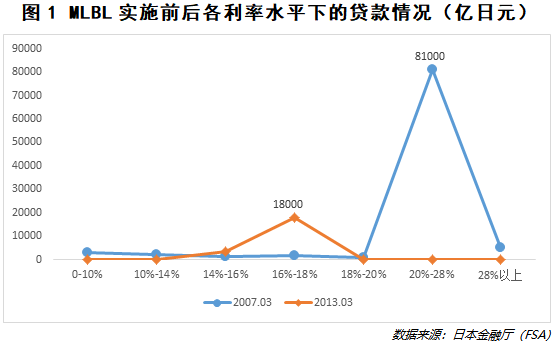 从对于信贷机构的影响来看,MLBL大幅度降低了金融信贷的供给。在2003年MLBL实施前,20%-28%利率水平上的贷款余额为8.1万亿日元,而在MLBL实施后,该利率水平下的贷款几乎为零。然而,相比于如此大幅度的信贷减少,14%-18%利率水平下的信贷却仅仅增加了不到两万亿日元(见图1)。