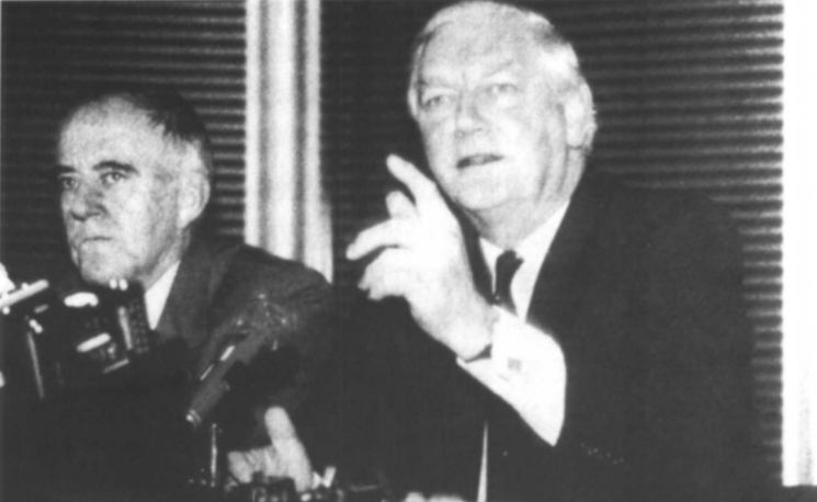 1990年12月27日,汇丰银行主席浦伟士(右)宣布汇丰重组,迁册伦敦。