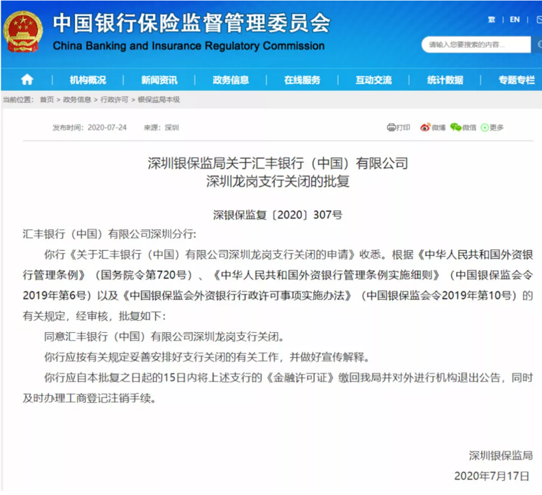 同日,深圳银保监局发布公告,同意汇丰银行(中国)有限公司(下称“汇丰中国”)深圳龙岗支行关闭。这是汇丰中国今年在中国内地关闭的第6家支行。