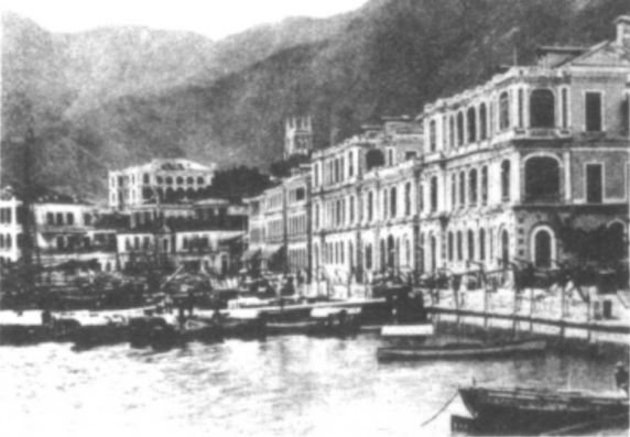 注:左方第一栋建筑是获多利大厦,1865-1882年,汇丰银行在此办公,右边第三栋建筑就是宝顺洋行(当时已倒闭)。