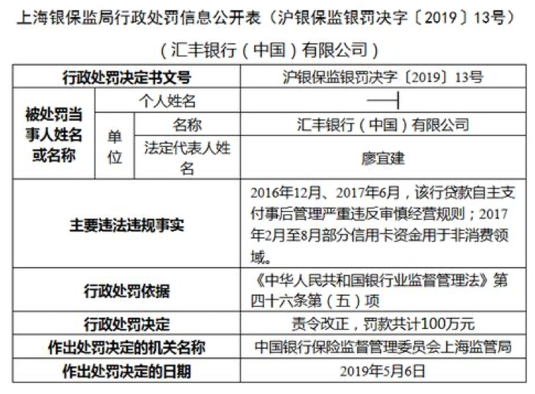 2019年5月,汇丰中国贷款自主支付事后管理严重违反审慎经营规则、部分信用卡资金用于非消费领域,遭罚100万元。