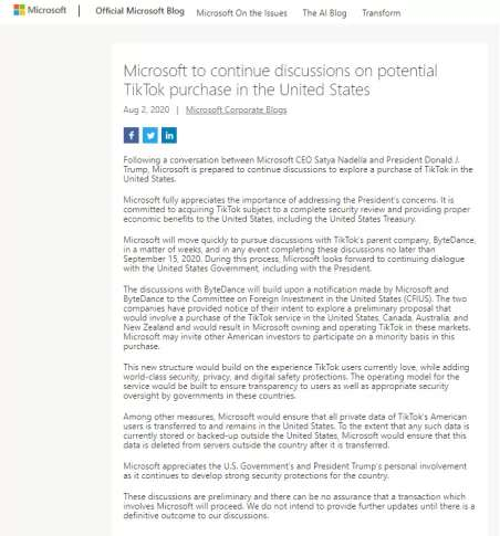 如果大家注意新闻的细节会发现,字节跳动与微软之间的谈判是由美国外国投资委员会监督的,该政府小组有阻止任何协议的达成的权限。说白了,这笔生意成不成就看特朗普心情,而这背后将必然涉及总统选举的博弈。甚至不能排除,如果哪家社交媒体公司支持特朗普,并且想得到“抖音”海外版,那么微软也随时可能被替换掉。而微软官方网站发布的消息也更彻底的证实了这一点。