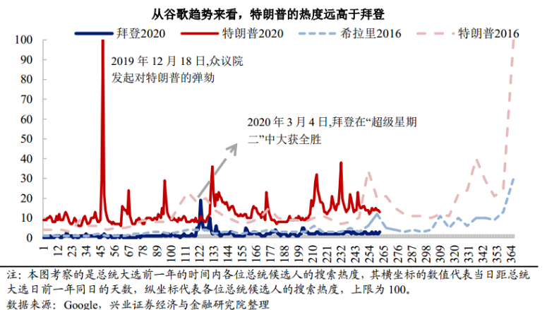 班农上一次是借助新媒体Facebook们提振特朗普的声望,而这一次则刚好相反,他企图借打压异己,禁封TikTok的方式,削弱反对声量,间接拉抬选举。 6月份,特朗普曾经遭遇过“塔尔萨滑铁卢”,据悉正式TikTok让特朗普大出洋相。 据中国经济网消息,6月份在俄克拉荷马州塔尔萨举行的竞选集会前,特朗普的竞选团队曾称,共有100万人预定了集会门票,然而根据塔尔萨市消防局的官方数据,当天登记入场的仅有约6200人,这使得能容纳2万人的集会场地空空荡荡。随后多家美国媒体爆料,“放特朗普鸽子”的活动大多是从TikTok上发起的,而TikTok上一些最知名的网红很多是通过对特朗普歇斯底里的嘲弄而成名的。 很明显,TikTok正成为一股反特朗普的媒体新势力,年轻人声势浩大,声量惊人,在Youtube和Facebook上看不到的真相,在这里都有。 如果任凭TikTok做大,不但不能再像2016那样借新媒体给选民洗脑,反而会让选民更加清醒,认清特朗普的本质。 据兴业证券的统计,从谷歌趋势热度来看特朗普,特朗普声量远高于拜登,如果结合民意调查会发现,懂王最近两个月,声量越大,民意越低,热度俨然成了票房毒药。