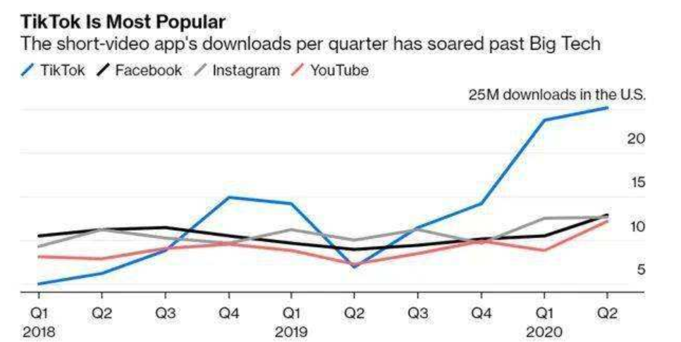 TikTok未完待续,但我们不禁要问一句,为什么特朗普选择在美国大选前3个月动手?这里面有何玄机? 根据公众号雅致小号的总结,特朗普对抖音的关键表述始于2019年11月,其后在2019年12月和2020年1月进一步采取动作,海军和陆军纷纷禁止使用或者安装: 2019年11月,特朗普政府宣称将对抖音在2017年收购美国社交媒体应用musical.ly展开国家安全审查。 2019年12月17日,美国海军以抖音构成网络安全威胁为由,禁止在政府的移动设备上使用该应用,在政府移动设备上安装了该软件的用户不得进入美国海军陆战队的内部网络。 2020年1月,美国陆军宣布禁止在政府分发的手机上安装抖音。 通过对比抖音在美国的下载量,我们发现,2019年四季度开始TikTok正式确立在美国对FACEBOOK们的领先优势。