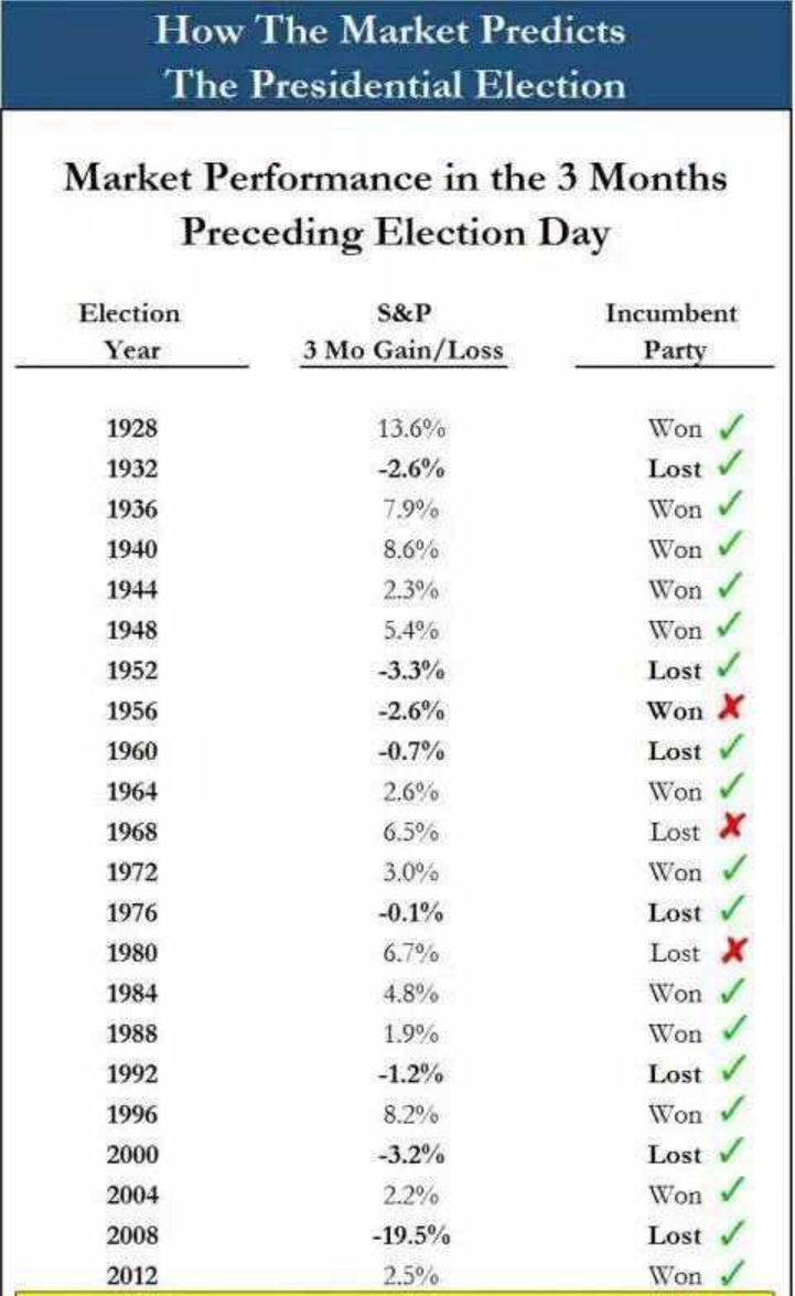 从美国大选的历史规律来看,大选前三个月标准普尔走势异常关键,如果这3个月标准普尔涨了,执政党大概率获胜,再干4年;反之,如果最后这三个月标准普尔跌了,那不好意思,执政党要卷铺盖卷走人,给新总统挪地方了。