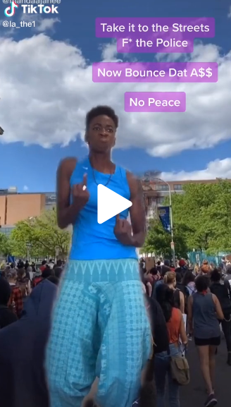 很快这段说唱在TIkTok上变得流行起来,很多人在TikTok上发布自己唱这段唱词的短视频,这段说唱也将继续流入街头,甚至发生了二次创作,唱词变成了稍文雅些但斗争针对性更强的:"take it to the streets, defund the police, no justice, no peace."(走上街头,停止给警方拨款,没有正义,没有和平)