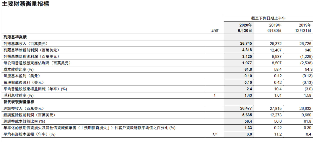 汇丰2020年中期业绩摘要