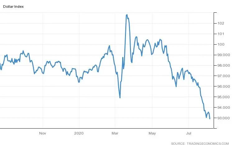 美元指数在过去一周加速下跌,跌至94以下,创下两年新低,7月份内的累计跌幅4.1%,创2010年9月以来最大月度跌幅,相比3月的最高位下跌了约10%。