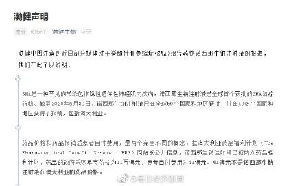 药物的研发和制造商渤健回应称,目前诺西那生钠注射液在国内属于自费药。