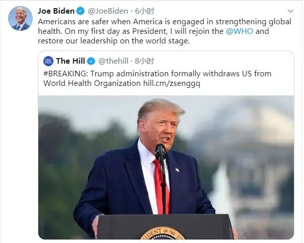 拜登在推特上发帖称:“当美国参与加强全球健康时,美国人才会更安全。在我成为总统的第一天,我就会重新加入世卫组织,并恢复我们在世界舞台上的领导地位。”