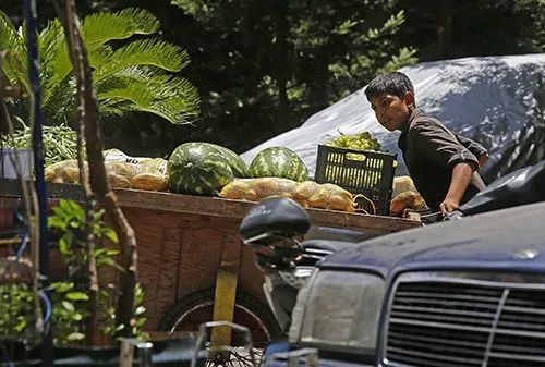 7月9日,一名小贩在黎巴嫩贝鲁特的街头售卖水果。