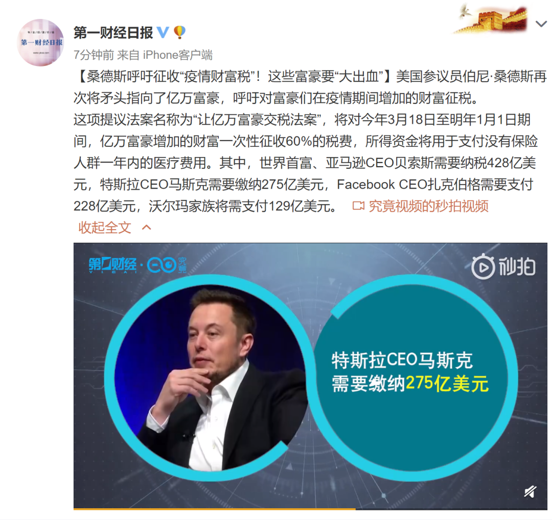 互联网行业最为显著,拼多多的黄铮财富翻倍,成为最耀眼的新富豪;马化腾的财富增长了近50%,马云也有近15%的增长。将富豪的财富增长和全国经济低迷、无数民众失业放在一起对比,确实挺扎眼。凡有贫富差距,就有人喊劫富济贫。有鉴于疫情期间富豪财富大增长的现实,最近美国参议员伯尼·桑德斯呼吁,对富豪们征收重税。桑德斯的提案要求,向富豪们征收一次性税收,剥夺他们在疫情期间(今年3月至明年1月)财富增长的60%,以用于社保和医疗补充。