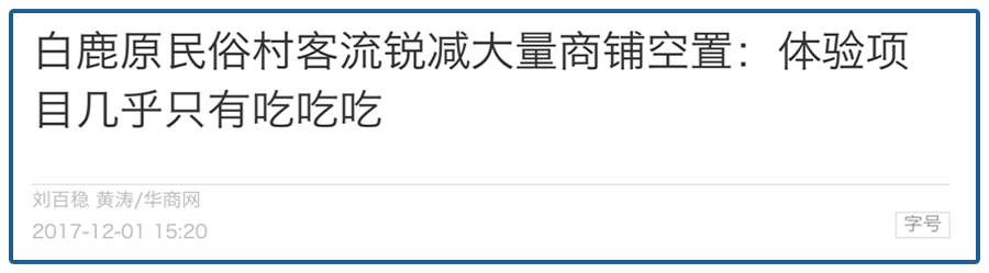 早在2017年建成之初,白鹿原的客流就已经有过一次“腰斩”的经历了。虽说村里有几个景点,但主营业务其实都是小吃,面对一座拔地而起的小吃街,再喜欢拍美食照的人也会感到厌倦。