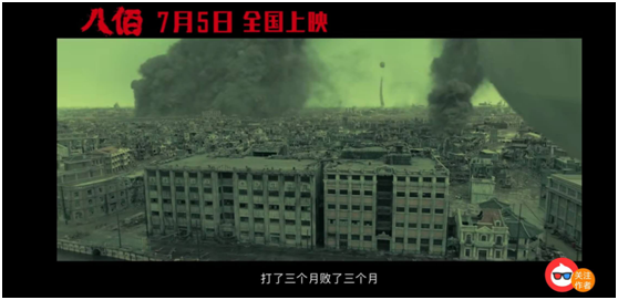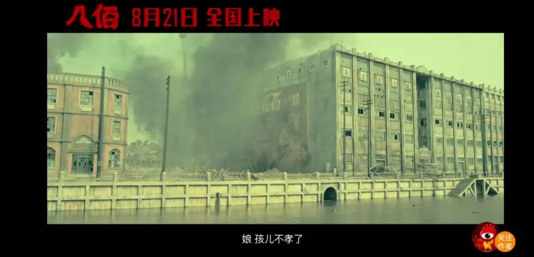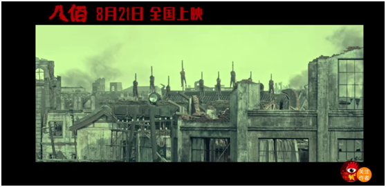 《八佰》有个镜头我印象很深,远看是乌鸦踩在一处废墟上,近看是一颗烧焦的人头。