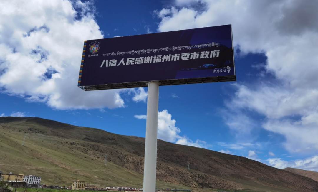 ▲西藏八宿人民在本地区最显眼的交通要道口,树立巨大的广告牌,表达对援藏的福州市委和福州人民的感谢。