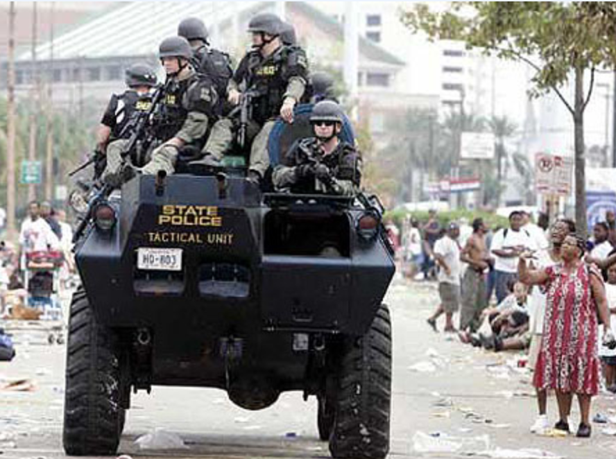 ▲在英美等西方社会,军警几乎不参与救灾,他们出现往往是为了镇压群众。例如在美国,在大型灾难后,很容易看到持枪镇压难民的情景。