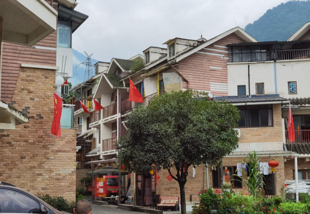▲重生后的映秀,家家户户都悬挂鲜艳的五星红旗。