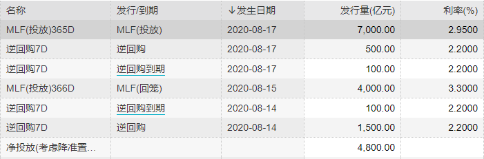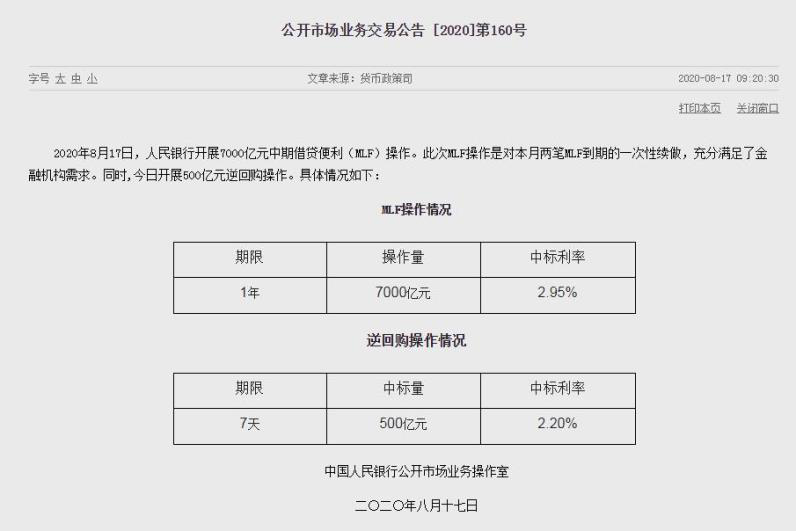 8月17日,央行公告称,开展7000亿元中期借贷便利(MLF)操作,中标利率2.95%。此次MLF操作是对本月两笔MLF到期的一次性续做,充分满足了金融机构需求。