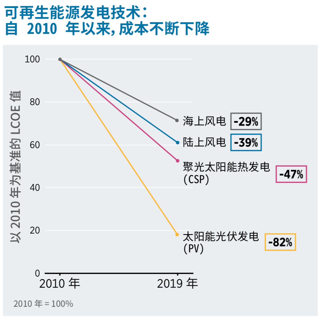 上图是各种新能源从2010年到2019年十年间成本下降情况。从中可见,太阳能成本下降了82%,下降幅度显著高于其他所有发电技术。为了更充分地理解用太阳能生产太阳能,能否使太阳能成本真正接近于零,我们需要仔细地分析一下影响太阳能成本的各个因素。