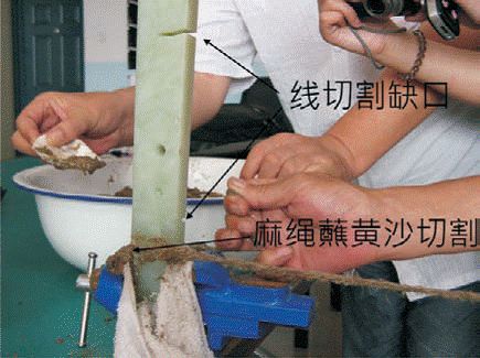 考古学家在验证良渚文明制作玉器的线切割工艺。引自 陈莺,陈逸民,良渚玉器的工艺特征(上),文物鉴定与鉴赏[J],2011-08-10。