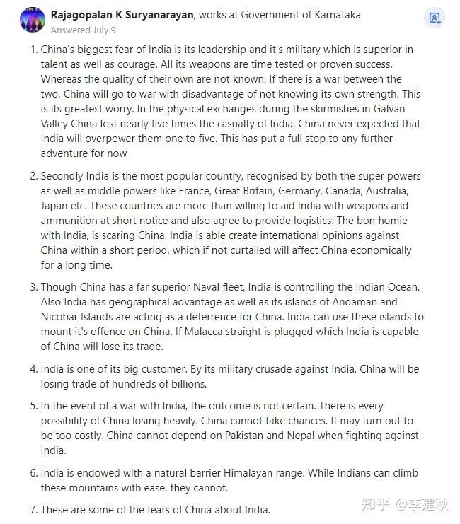 正如同我昨天在知乎回答的一样,有一个问题叫“中国对印度最大的恐惧是什么”,第一名的回答是:
