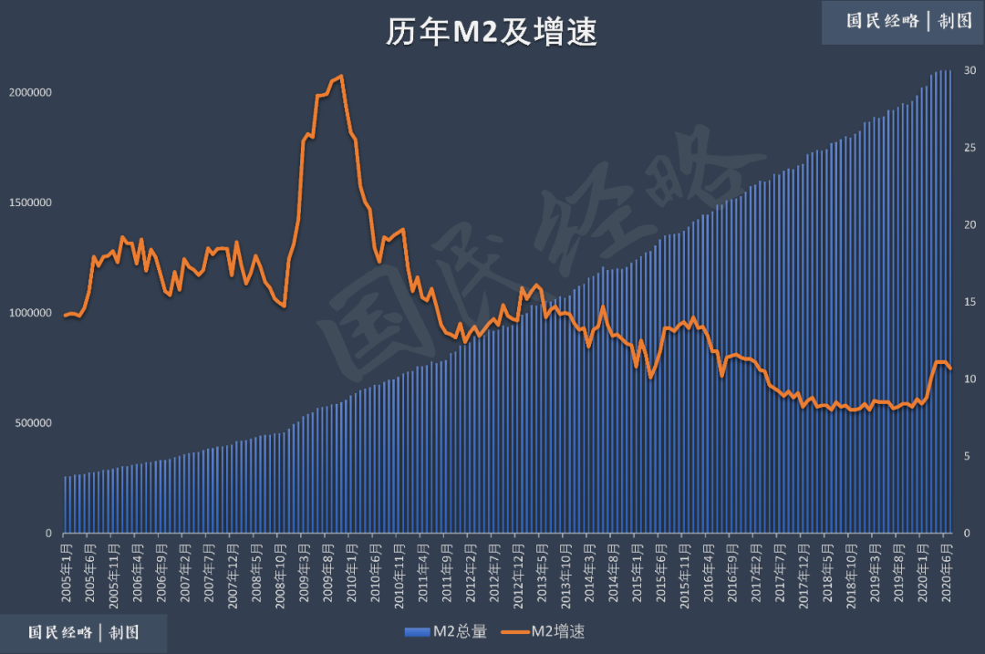M2是现金、活期存款与定期存款之和,相当于货币供应总量。M2增速的高低,代表着货币供给的松紧,今年上半年,M2同比增长11.1%,创下近几年新高。