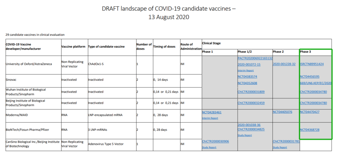 截至8月13日全球疫苗研发情况,绿框内为进入Ⅲ期临床试验的疫苗。图源:世卫组织官网
