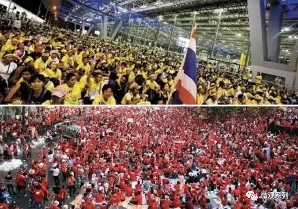 过去泰国的街头示威是典型的红黄对立,1997年亚洲金融风暴重创泰国后,泰国电信大亨他信,创建“泰爱泰党”。