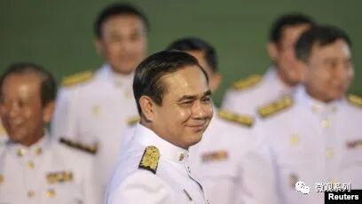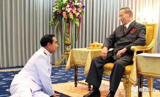 泰国现在的总理是巴育(军方势力代表),就是上面那个趴在泰王面前的人。