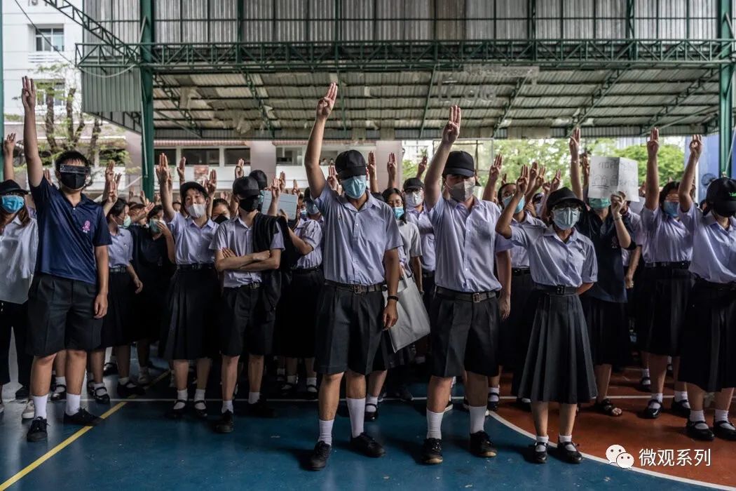 甚至在总理巴育的演讲场合,也有大学生冲到前面高举三指抗议军政府统治。