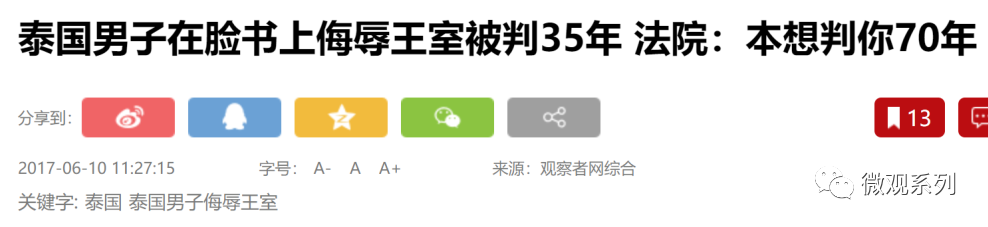 泰国有专门的“冒犯君主罪”,该罪明文规定,凡是侮辱、诽谤、威胁国王、王后、王储等皇室成员的人,都将面临3-15年监禁。