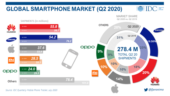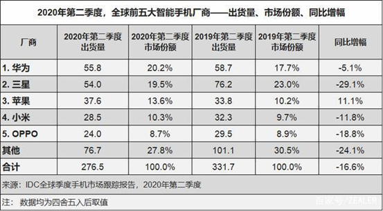 戏剧性的2020年第二季度,全球手机销量数据显示,三星手机同比降幅29.1%,华为降幅5.1%,克服美国制裁阻力反超三星成为全球第一,市场份额增至20.2%,共售出5580万台。而应该警惕的是在全球手机市场下滑严重的同时,苹果是唯一一家出货量同比增长(11.1%,3760万部)的手机厂商。
