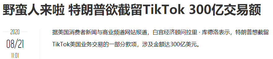 8月3日,宣称Tik Tok如果45天卖给美国企业,可以继续在美国经营,川总宣称美国政府应该从TikTok业务的收购交易总价当中抽取“很大一部分”佣金,交易对手微软CEO还发声感谢了美国政府;