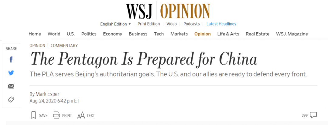 就在U-2擅闯事件的前一日,美国国防部长埃斯珀在《华尔街日报》发表了一篇堪比“战斗檄文”的署名文章,标题叫《对抗中国,五角大楼已做好准备》,极力渲染“中国军事威胁”。