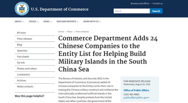 美国商务部宣布将“参与中国南海岛礁建设”的24家中国企业纳入“实体清单”。图源:美媒