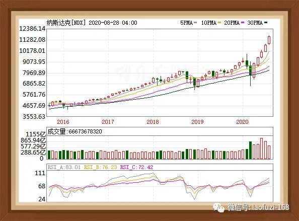 美国纳斯达克指数月K线图(截止2020年8月28日,东方财富下载)