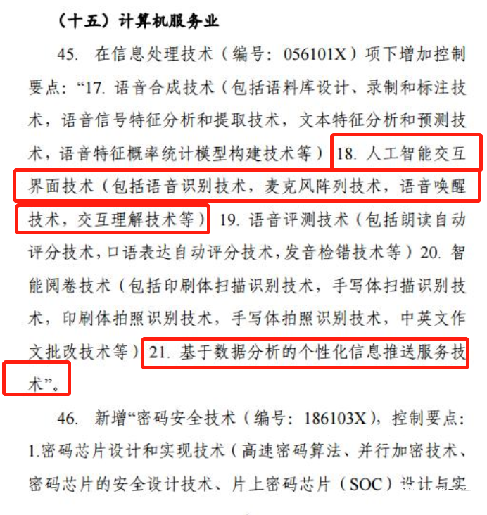目录在限制出口部分计算机服务业类的信息处理技术项下,新增的第21条关于“基于数据分析的个性化信息推送服务技术”、第18条关于“人工智能交互界面技术”等控制要点。
