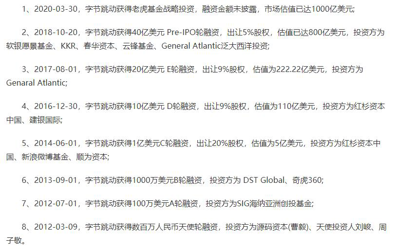 字节跳动从2012年的天使轮至今经历了8次融资,其中不乏 Sequoia Capital(红杉资本)、SIG(海纳)、Tiger Fund(老虎基金)、GA(泛大西洋资本)等西方财团。