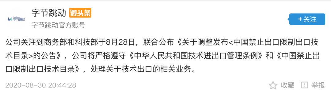 就在昨晚(8月30日),字节跳动声明表示,将严格遵守规定,处理关于技术出口的相关业务。