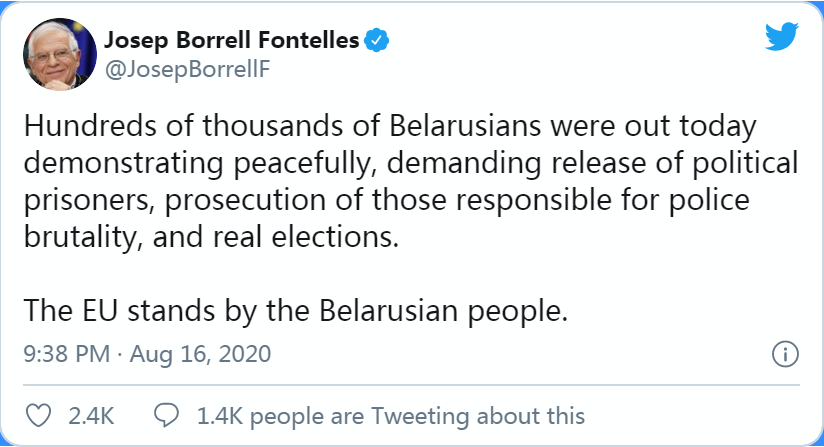 欧盟委员会副主席博雷尔甚至在推特上赞扬了抗议活动,“欧盟站在白俄罗斯人民这一边。”