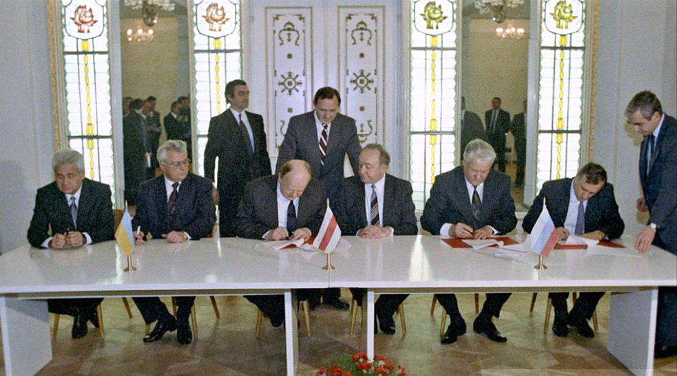 1991年12月8日俄罗斯总统叶利钦、乌克兰总统克拉夫丘克、白俄罗斯最高苏维埃主席舒什克维奇三人,在比亚沃维耶扎森林举行秘密会议后,由三国领导人签订《别洛韦日协议》。