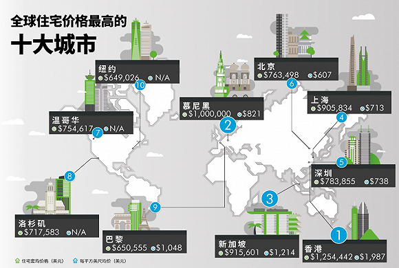 根据世邦魏理仕发布的《2020全球生活报告》,全球住宅价格排名前十的城市分别为:香港、慕尼黑、新加坡、上海、深圳、北京(城区)、温哥华、洛杉矶、巴黎和纽约。