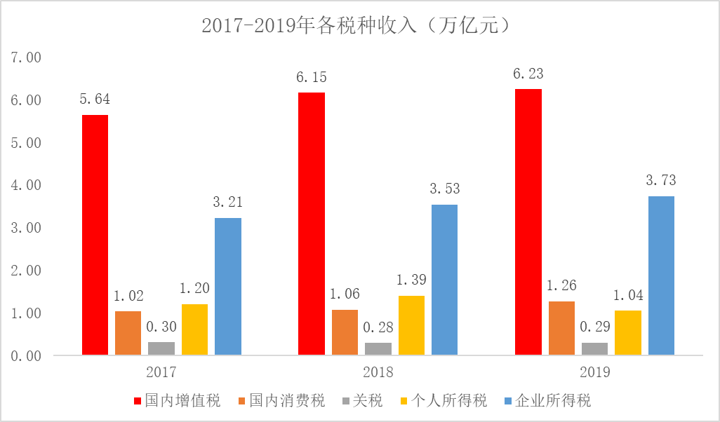 中国的税收收入中,间接税占了很大比重。以营改增改革后2017-2019年的税收收入情况为例,在主要税种中,作为间接税的增值税比起主要的直接税个人所得税和企业所得税加起来还要高。而另外两种主要间接税,国内消费税和关税也很可观。