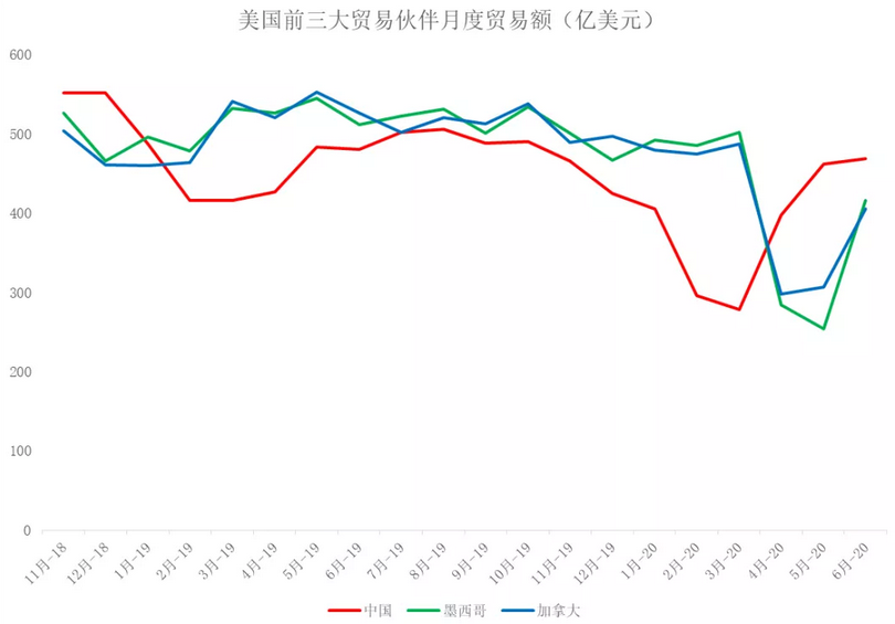 而且对中国商品加关税也确实阻碍中国商品出口到美国,从2019年1月开始,中国就不再是美国的第一大贸易伙伴,而且它的贸易额与加拿大、墨西哥与美国贸易额的差距越拉越大。