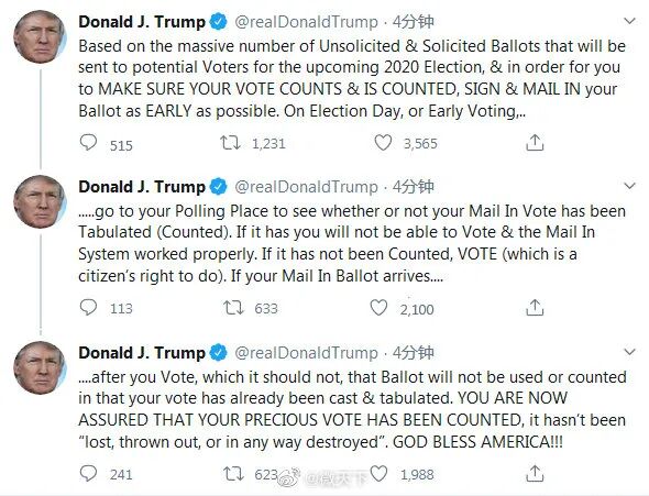 不仅改口支持邮寄选票,还“建议”支持者两次投票了。