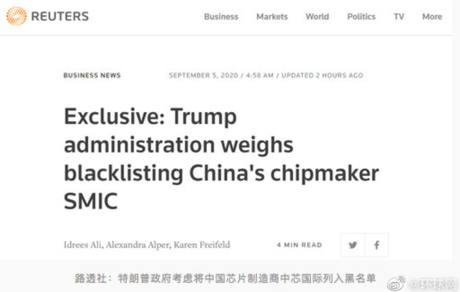 9月4日,五角大楼称,特朗普政府正考虑是否将中国顶级芯片制造商中芯国际(SMIC)列入“贸易黑名单”。