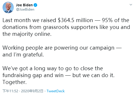据拜登团队的数据,这些捐款95%来自基层支持者,而且有超过150万人进行了首次捐赠。