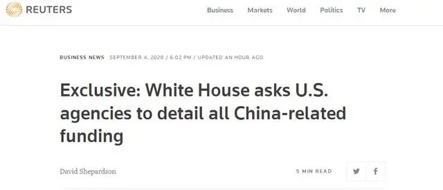英国路透社4日消息称,他们看到白宫行政管理和预算局(OMB)的一份文件,名为“与中国的战略竞争纵览”,要求美国各个机构提交“跨部门的联邦资金数据”,包括一切“整体上对中国GDP或科技实力有贡献的”支出细节。