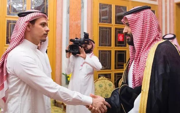 (卡舒吉的儿子萨拉赫·卡舒吉(左)2018年10月23日与穆罕默德·本·萨勒曼王储见面)